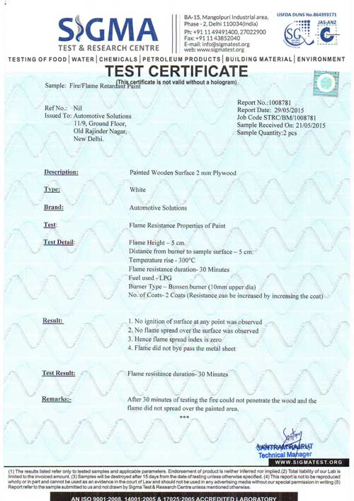 Automotive Solutions offers professional solutions in fire retardant paint systems. We have the experience and technical know-how to give the best and innovative range of fire retardant paints. We also offer superior quality fire resistant paint systems for all types of wood. At Automotive Solutions, we are engaged in offering custom designed fire retardant paint services that will meet specific requirements of our clients.